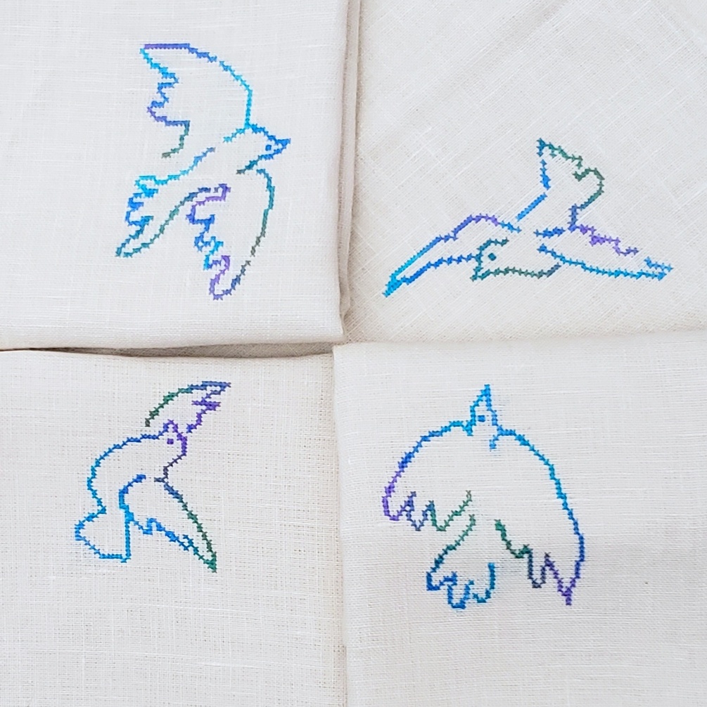 This pattern happend by accident, I really liked that dove I charted a few weeks ago, and wanted to stitch it on some napkins, but I had 4 napkins and I didn't want to stitch the same things 4 times, so I made 4 different doves that are smaller and some olive branches. It was just a bunch of elements for the napkins. A couple of days later, I realized I really like the composition, and now I want to stitch the whole thing. It's a really quick fun stitch 100x100 in 2 colors.