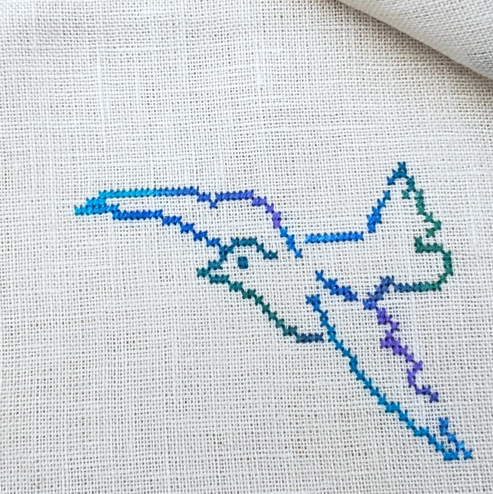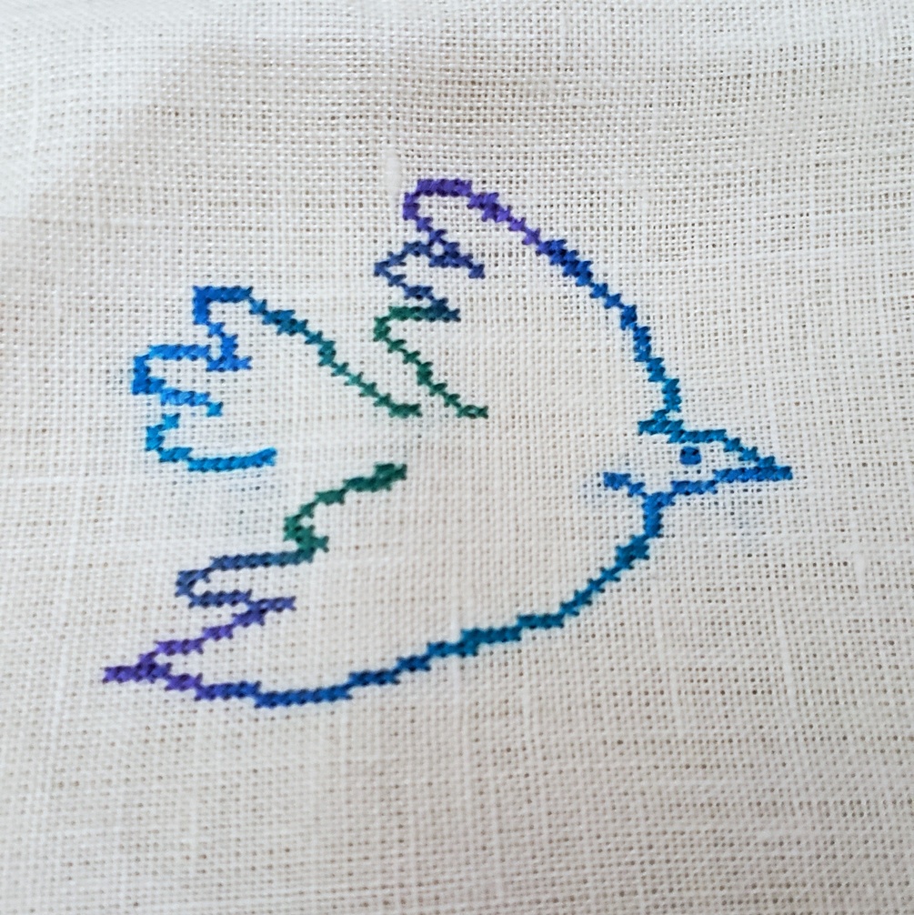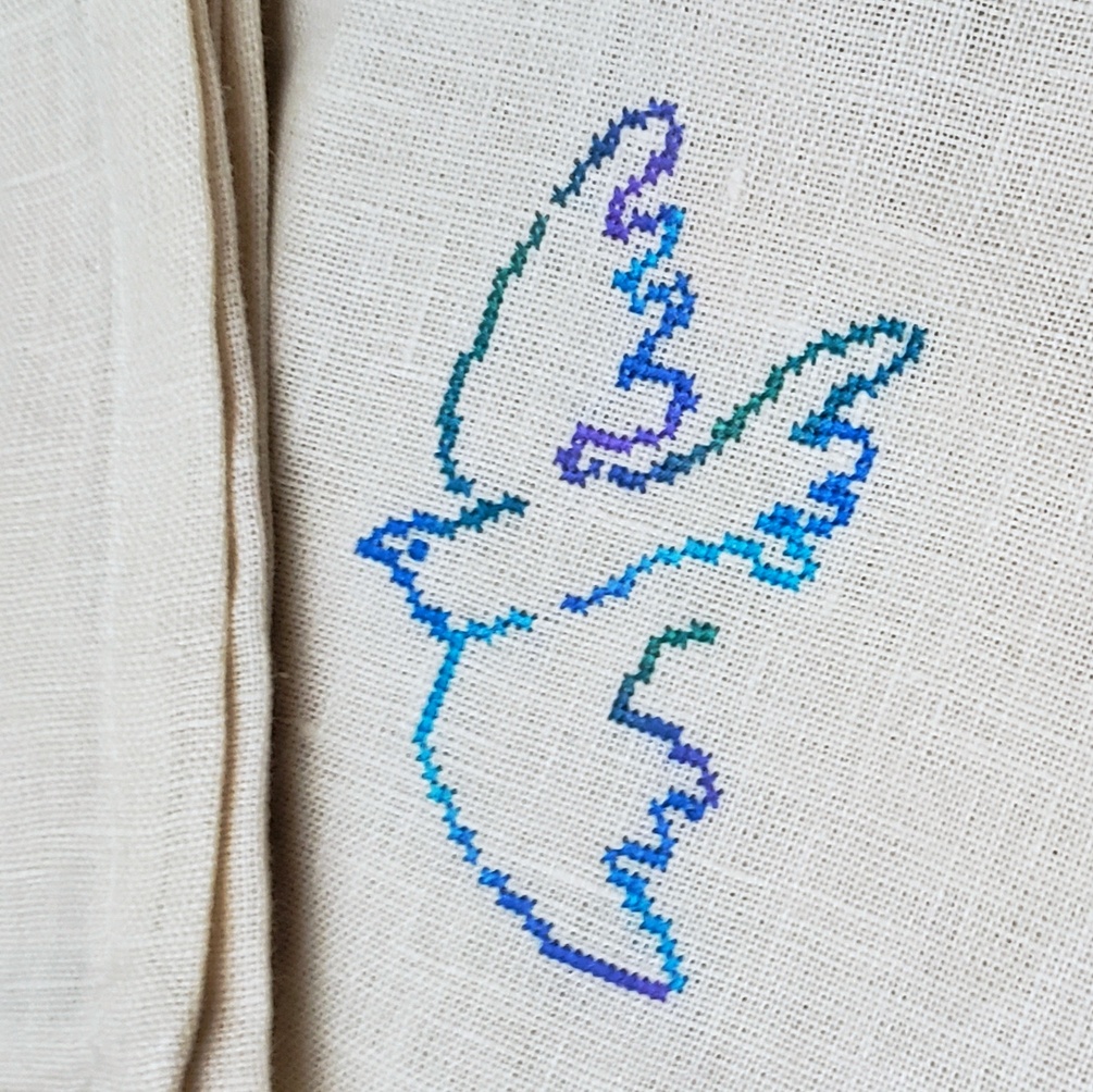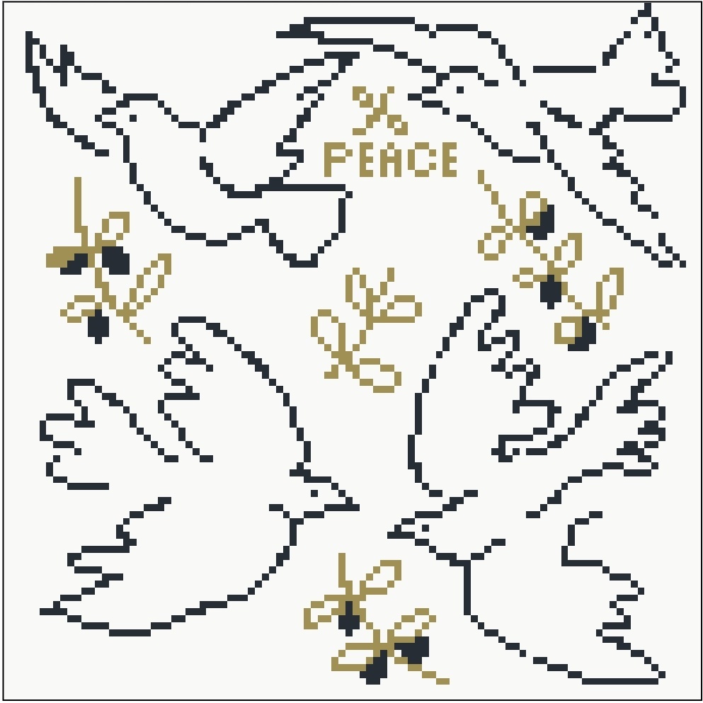 This pattern happend by accident, I really liked that dove I charted a few weeks ago, and wanted to stitch it on some napkins, but I had 4 napkins and I didn't want to stitch the same things 4 times, so I made 4 different doves that are smaller and some olive branches. It was just a bunch of elements for the napkins. A couple of days later, I realized I really like the composition, and now I want to stitch the whole thing. It's a really quick fun stitch 100x100 in 2 colors.